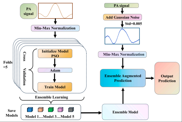 团队提出了一种基于粒子群优化与集成增强预测策略的卷积神经网络模型(PSO-EAP-CNN),解决了光声光谱气体检测中噪声引起的信号相关性退化问题。该模型通过多尺度特征提取机制与粒子群算法优化网络参数,显著提升了模型收敛速度和预测稳定性;同时引入集成增强预测策略,在噪声环境下进一步增强模型的鲁棒性和泛化能力。实验表明,PSO-EAP-CNN相比传统CNN模型,预测精度提升显著:平均绝对误差降低43.76%,均方根误差降低39.25%,平均绝对百分比误差降低51.15%。本研究为复杂噪声环境下的痕量气体检测提供了新方法,推动了深度学习在光声光谱领域的应用发展。该成果发表于《Photoacoustics》(《光声学》,中科院一区TOP,影响因子7.1),2023级硕士研究生苏占上为论文第一作者,王朋朋副教授、朱存光副教授和中国海洋大学王福鹏副教授为共同通讯作者,伟德bv1946官网首页为第一署名单位。