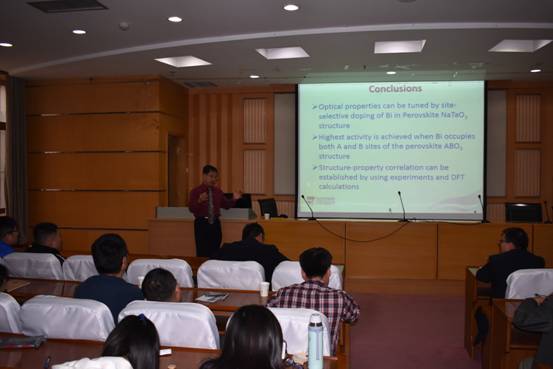 报告会上,Chen Zhong教授介绍了光催化技术的概念和相关知识以及光催化技术的研究进展,详细介绍了利用受控掺杂实现NaTaO3进行光催化的技术,并进一步介绍了NaTaO3光催化的优点和现阶段的研究进展。会后在座的老师们和同学们针对光催化的问题与Chen Zhong教授展开了讨论。