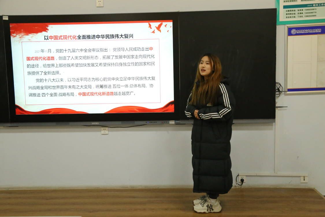 在学习过程中,主讲人借助PPT,用“九个数字”对党的二十大精神进行了详细讲解,让同学们深入领会其中蕴含的重要思想、重要观点、重大战略、重大举措,推进党的二十大精神入脑入心。主讲人指出党的二十大是在全党全国各族人民迈上全面建设社会主义现代化国家新征程、向第二个百年奋斗目标进军的关键时刻召开的一次十分重要的大会,是一次高举旗帜、凝聚力量、团结奋进的大会。党的二十大报告描绘了全面建设社会主义现代化国家、全面推进中华民族伟大复兴的宏伟蓝图,为新时代新征程党和国家事业发展、实现第二个百年奋斗目标指明了前进方向、确立了行动指南。青年人生逢其时,应积极汲取奋进力量,努力成长为实现中华民族伟大复兴的先锋力量。