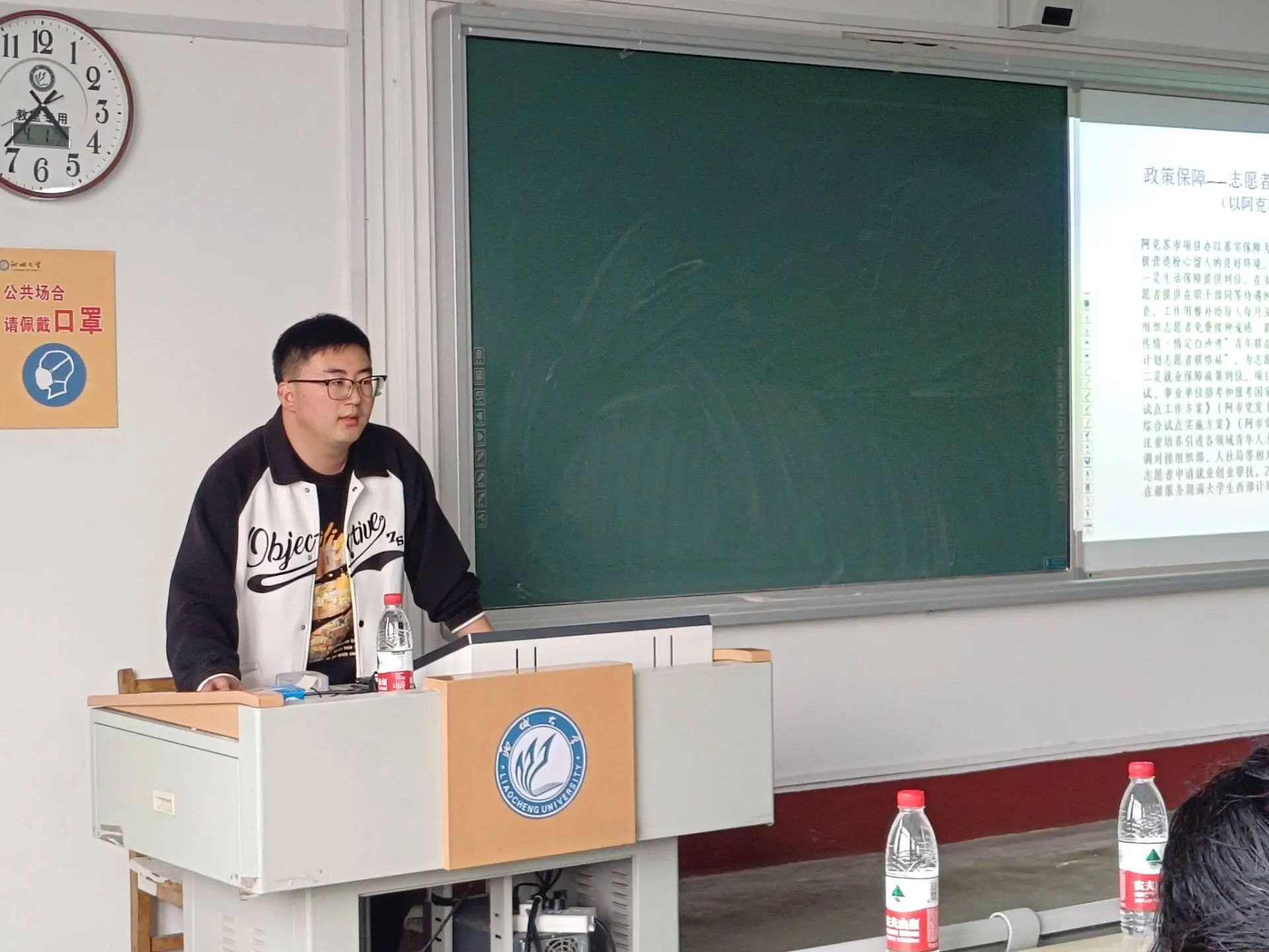 在分享过程中,孙雨鑫还讲述了他在西部计划中的有趣故事和温暖人心的经历,这些故事不仅激发了同学们的热情,更让同学们对志愿服务有了更深刻的认识。他还详细介绍了在阿克苏地区的主要工作内容,以及这段经历给他带来的心灵触动和成长。孙雨鑫强调,“到西部去”不仅仅是一句口号,更是他们志愿者心底的强烈期望。他鼓励同学们要同心协力推动志愿服务事业的高质量发展,积极发挥志愿服务的积极作用,共同谱写新时代志愿服务的新篇章。最后,孙雨鑫耐心解答了同学们关于“西部计划”的各种疑问,包括工作生活补贴、享受的政策以及公务员及事业编考录等国家保障政策等。他的回答让同学们对“西部计划”有了更加清晰的认识,也为未来的选择提供了有力的支持。