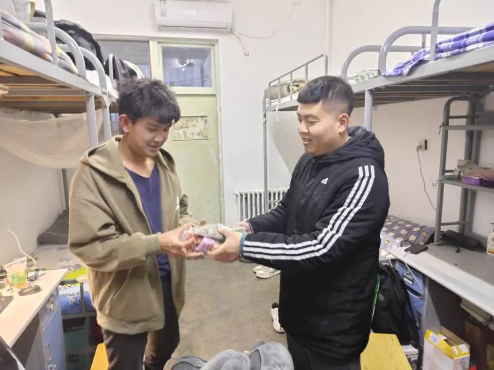 在2024年元旦来临前夕,为同学们增添新年的暖意,12月31日晚,伟德国际1946源于英国举办了“元旦佳节,‘理’有温情时刻,师生携手,‘工’建异乡之家”活动。团委书记洪文静,班主任李立军,辅导员徐光建、王平走进宿舍,向同学们送去学院的问候和新年的祝福,为全体本科360余个宿舍发放糖果、干果等元旦慰问礼物。