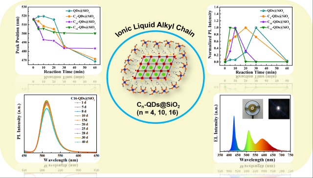 核壳量子点由于其优异的光电子特性而成为未来光电器件的候选者。然而,不稳定性和硅烷水解过程中醇和水的生成问题限制了它们的进一步发展。本工作通过引入不同烷基链长度的离子液体(ILs)作为表面配体,同时利用四甲氧基硅烷(TMOS)水解作用,成功制备了Cn-QDs@SiO2 (n = 4, 10, 16)量子点。随着烷基链长度的增加,量子点峰位置蓝移值和 PL 强度达到最大值的时间减小,表明烷基链的增长加快TMOS水解速度。由于ILs表面钝化作用,量子点的荧光量子产率高达92.83%且具有优异的稳定性。基于该量子点优异的光学性质和稳定性,成功将其应用于白光发光二极管。本研究为解决硅包覆量子点的稳定性问题,促进硅包覆钙钛矿量子点在固态发光二极管中的实际应用提供了一种有效策略。