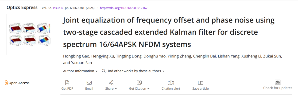 近日,许恒迎教授团队在非线性频分复用光纤传输系统领域取得进展。该研究成果以“Joint equalization of frequency offset and phase noise using two-stage cascaded extended Kalman filter for discrete spectrum 16/64APSK NFDM systems”(“基于两阶段扩展卡尔曼滤波器的离散频谱非线性频分复用系统频偏和相位噪声均衡方案”)为题,发表在光学领域权威期刊《Optics Express》(《光学快报》,中科院2区期刊,影响因子3.8)。