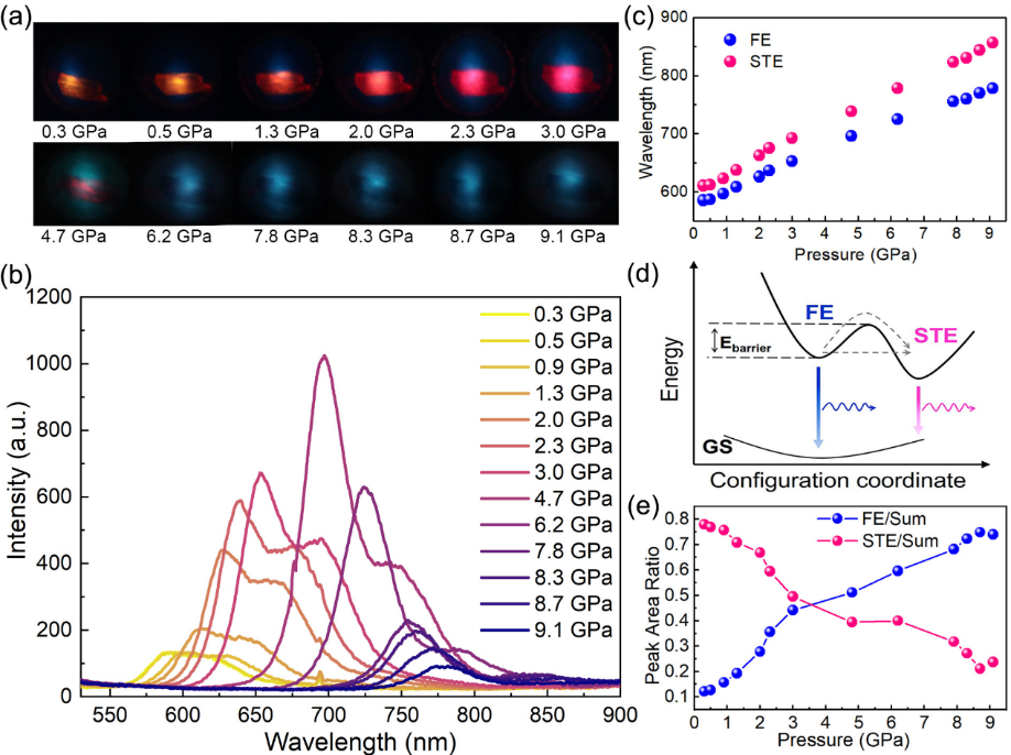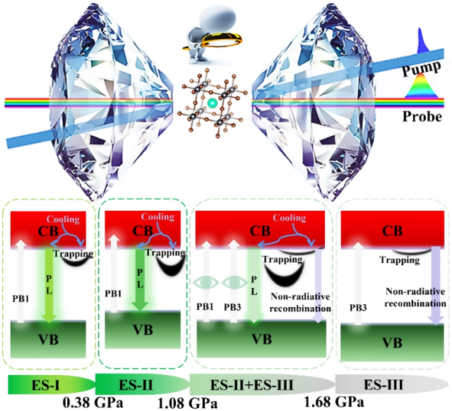 进展一:钙钛矿材料中的载流子超快动力学行为一直以来备受关注。刘才龙教授团队利用高压原位稳态光致发光、稳态吸收和飞秒瞬态吸收光谱探测技术,对CsPbBr3量子点压致电子态转变、荧光猝灭和带隙演化中的超快动力学行为进行了实验探究。研究发现,高压原位飞秒瞬态吸收光谱可以有效区分混合电子态,并获得压力依赖的载流子超快动力学寿命,揭示了CsPbBr3量子点压致荧光猝灭和消失的微观物理机制。这项工作对于改善钙钛矿材料的光物理性能至关重要,为拓宽其在光电探测器、发光二极管和太阳能电池等领域的应用提供了重要的指导。相关研究成果以“Ultrafast Dynamics across Pressure-Induced Electronic State Transitions, Fluorescence Quenching, and Bandgap Evolution in CsPbBr3 Quantum Dots”(CsPbBr3量子点在压力诱导的电子态转变,荧光猝灭和带隙演化过程中的超快动力学)为题发表在《Advanced Science》(《先进科学》)上。2021级硕士生陈林和楚亚博士为共同第一作者,张海娃博士、郑州大学郭海中教授和刘才龙教授为共同通讯作者,伟德bv1946官网首页为第一署名单位。