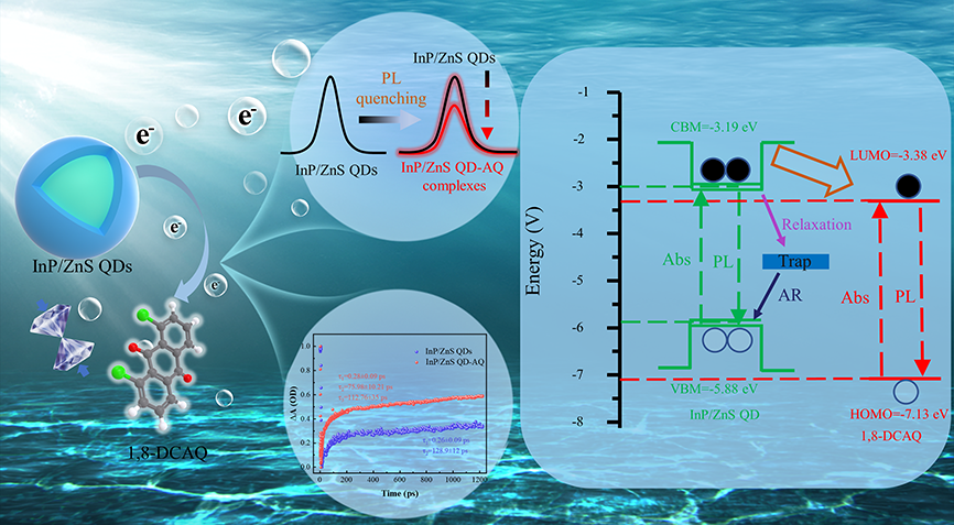 电子转移速率的调控对提高电子转移系统的光电转换效率至关重要,近年来逐渐成为研究热点。刘才龙教授团队利用高压原位瞬态吸收光谱探测技术,提出了压力调控甲苯中InP/ZnS量子点-蒽醌(InP/ZnS QD-AQ)复合体系电子转移的影响机制。研究表明,从常压至0.9GPa,压致供-受体间距的减小可以有效促进InP/ZnS QD-AQ复合体系的电子转移过程;从0.9GPa至2.1GPa,InP/ZnS QD-AQ复合体系的电子转移过程被抑制是压致InP/ZnS量子点的量子限域效应和蒽醌分子的压致AIE效应共同作用的结果。此项工作为基于供-受体复合体系光电器件的发展提供理论依据,并将促进其在光电转换领域中的应用。相关成果以“Electron transfer tuned by pressure-dependent aggregation-induced emission in InP/ZnS quantum dot-anthraquinone complexes(通过压力依赖的聚集诱导发光调控InP/ZnS量子点-蒽醌复合体中的电子转移)”为题发表在《Applied Physics Letters》(《应用物理快报》)国际期刊上。2021级硕士生秦霞霞和张海娃博士为论文共同第一作者,楚亚博士、王庆林教授、郑州大学郭海忠教授和刘才龙教授为共同通讯作者,伟德bv1946官网首页为第一署名单位。