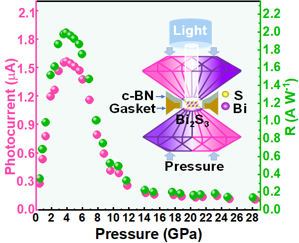 Bi2S3具有低毒性、低合成成本、吸收系数及载流子迁移率高等优点,成为光电探测器的潜在候选者。然而,由于其电子-空穴复合速度快和光腐蚀等影响降低了其光敏行为。为克服这一挑战,刘才龙教授团队提出压力调控Bi2S3光电响应的方案。通过将高压原位光电流、变温电阻率、拉曼散射光谱、可见吸收光谱测量和理论计算方法相结合,系统研究了压力作用下Bi2S3的光电、电输运、振动模式和能带结构。研究发现,压力作用下Bi2S3显示出两种不同的光响应信号(正/负光电流),0.5~4.0GPa范围内光电流随压力的增加出现显著增强(最大值约为初始值的5.6倍)。在30.3GPa以上,Bi2S3呈现负光电流响应,可归因于压致金属化相变引起的光热效应。研究结果为调控Bi2S3的光电性能提供了新思路,为优化基于Bi2S3光电子器件提供了更多的可能性。相关成果以“Pressure-induced photo responsiveness enhancement and positive–negative switch in Bi2S3(Bi2S3中的压力诱导光响应增强和正负光电流转换)”为题发表在《Applied Physics Letters》(《应用物理快报》)上。2021级硕士研究生冯浩铖和张国召博士为论文共同第一作者,王光宇博士、房媛媛副教授和冯振豹副教授为共同通讯作者,伟德bv1946官网首页为第一署名单位。