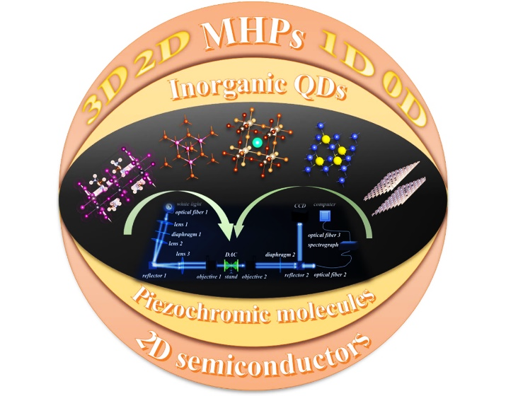 进展三:近年来,压力诱导带隙调节作为一种新颖而有效的手段,揭示了固有能带性质和深层结构-性能的关系。基于几种典型的半导体材料,包括金属卤化物钙钛矿、无机量子点、压致变色分子化合物和二维半导体材料,刘才龙教授团队概述了利用显微稳态紫外-可见吸收光谱技术的压力诱导带隙响应的系列研究,总结了高压条件下结构对带隙演变的影响以及带隙工程的一般原理,为环境条件下的材料设计提供指导。相关研究成果以“A review: comprehensive investigation on bandgap engineering under high pressure utilizing microscopic UV-Vis absorption spectroscopy(评论:关于利用微区紫外-可见吸收光谱技术在高压下进行能隙工程研究的综合调查)”为题发表在《APL Materials》(《APL材料》)上。2021级硕士生陈林为论文第一作者,张海娃博士、李茜教授和刘才龙教授为共同通讯作者,伟德bv1946官网首页为唯一署名单位。