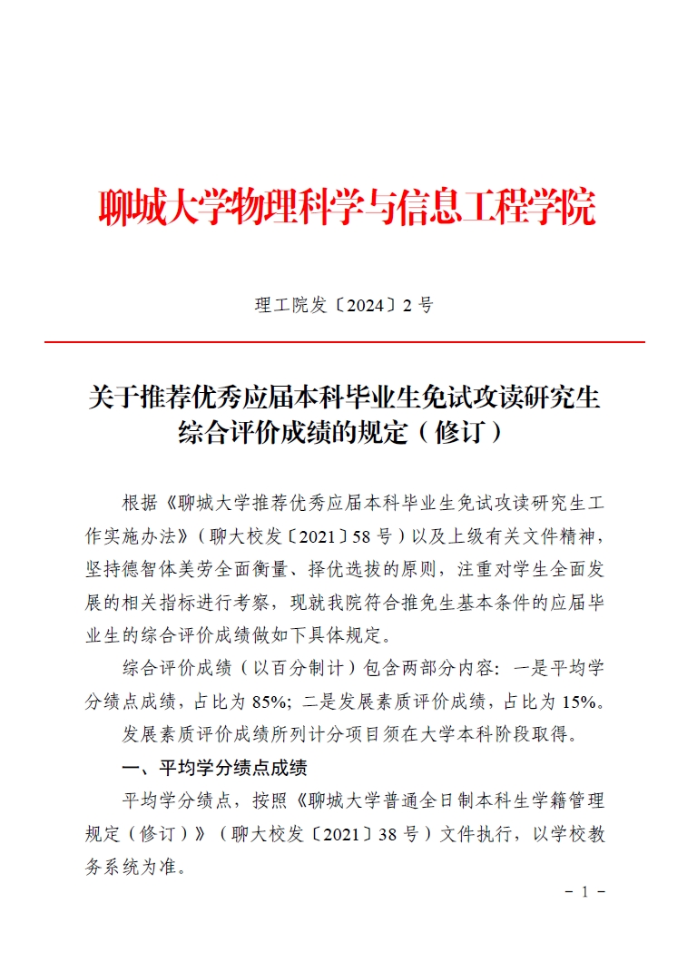 理工院发〔2024〕2号-关于推荐优秀应届本科毕业生免试攻读研究生综合评价成绩的规定(修订) 发布时间:2024-09-04 作者: 附件: 1.聊大校发〔2021〕58号:伟德bv1946官网首页关于印发《推荐优秀应届本科毕业生免试攻读研究生工作实施办法》的通知 2.聊大校发〔2021〕38号:伟德bv1946官网首页关于印发《伟德bv1946官网首页普通全日制本科生学籍管理规定(修订)》的通知 3.伟德bv1946官网首页大学生学科竞赛目录(2024版) 4.学术论文类别: