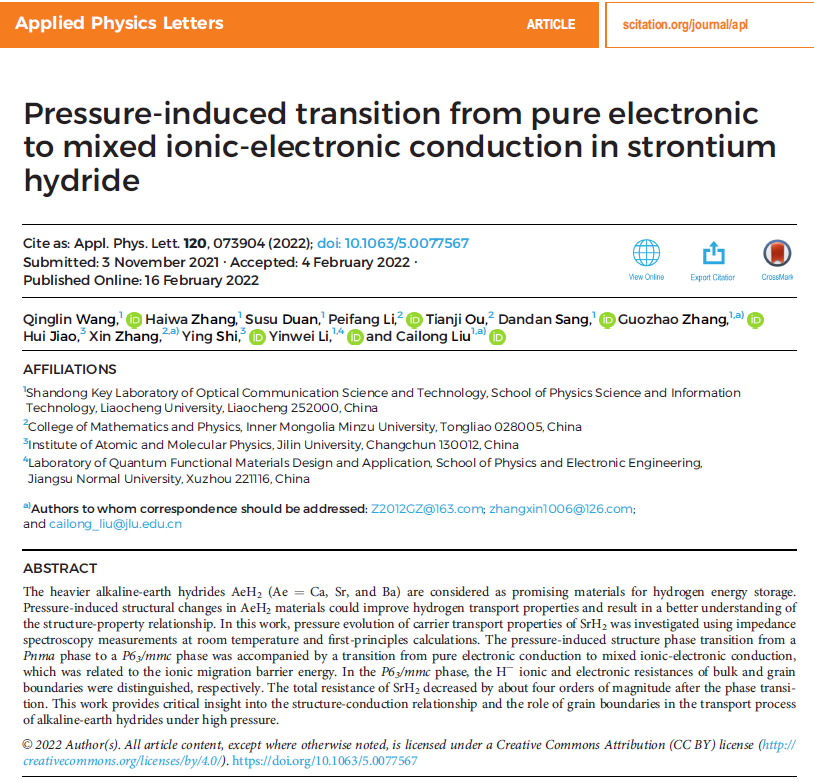 近日,伟德国际1946源于英国/山东省光通信科学与技术重点实验室刘才龙教授团队在碱土金属氢化物SrH2高压下的载流子输运行为研究方面取得重要进展,研究成果以“Pressure-induced transition from pure electronic to mixed ionic-electronic conduction in strontium hydride”为题发表在物理类权威期刊《Applied Physics Letters》(中科院二区Top期刊,Nature Index收录)上。王庆林副教授为论文第一作者,张国召博士、刘才龙教授为论文通讯作者,伟德bv1946官网首页为第一通讯单位。